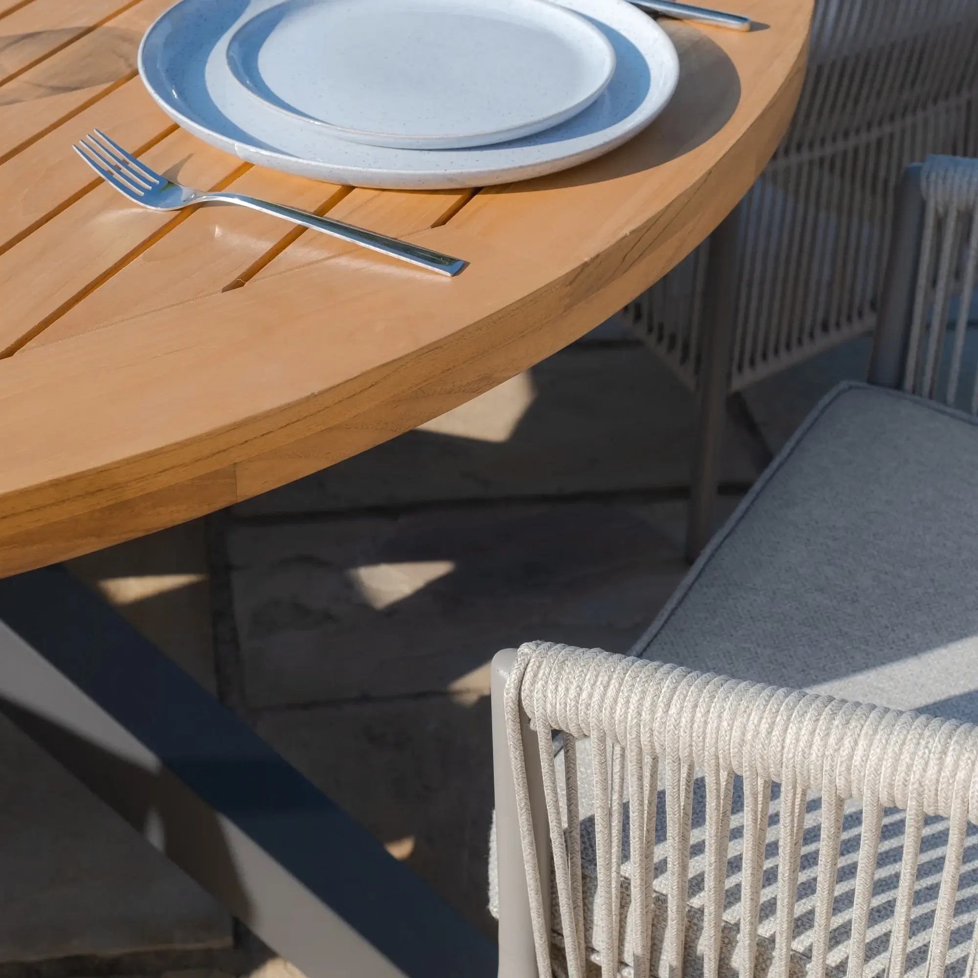 The combination of the charcoal aluminium frame and the teak tabletop creates a beautiful contrast that will elevate any garden or patio setting. Paired with 6 Maldives Rope Weave Dining Chairs, the set offers both style and functionality.