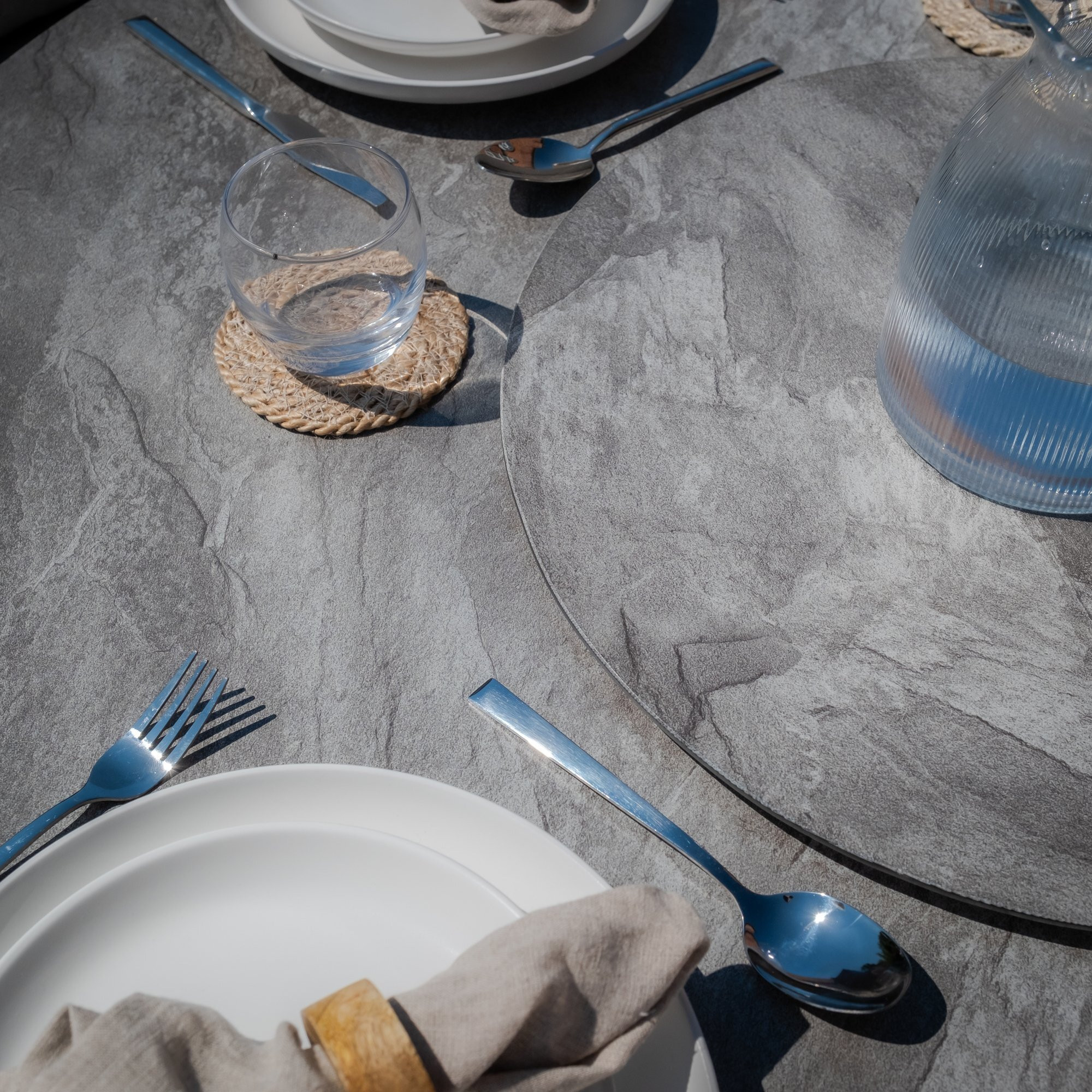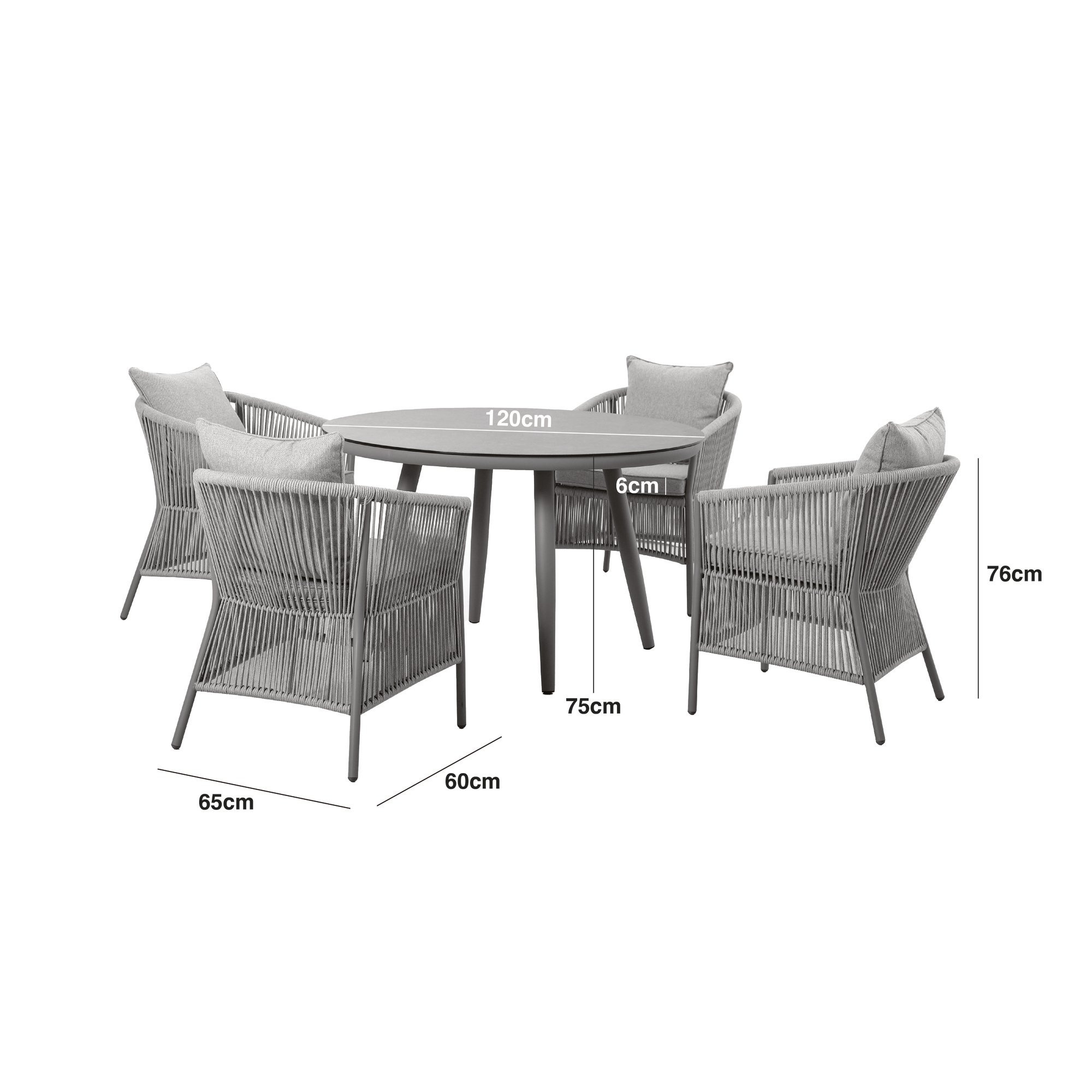 Crafted with durable dawn grey aluminium frames, the chairs are built to last, resisting rust and wear, while the included square back cushions, with piped edging, provide extra comfort for leisurely dining. The set is anchored by a stunning round dining table, topped with a ceramic glass that features a sleek marble-effect surface, adding a luxurious touch without the weight of natural stone. For added functionality, the table includes a removable Lazy Susan, making sharing and serving easier while adding an extra element of convenience.