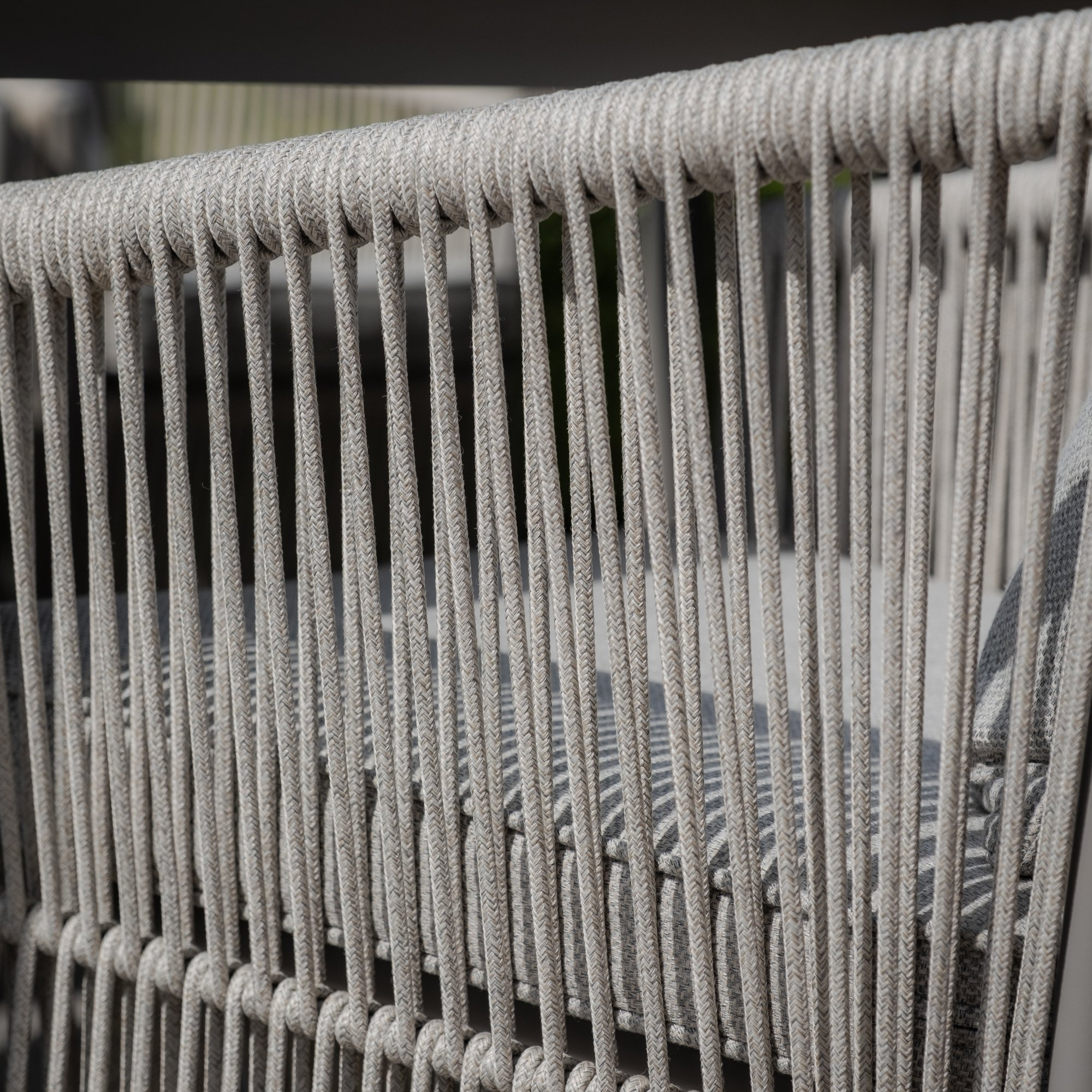 The chairs boast a light grey rope weave, intricately wrapped in clean, straight lines, with the rope split into two sections, adding texture and visual appeal. The V-shaped back detailing enhances the design, offering both support and a touch of refinement.