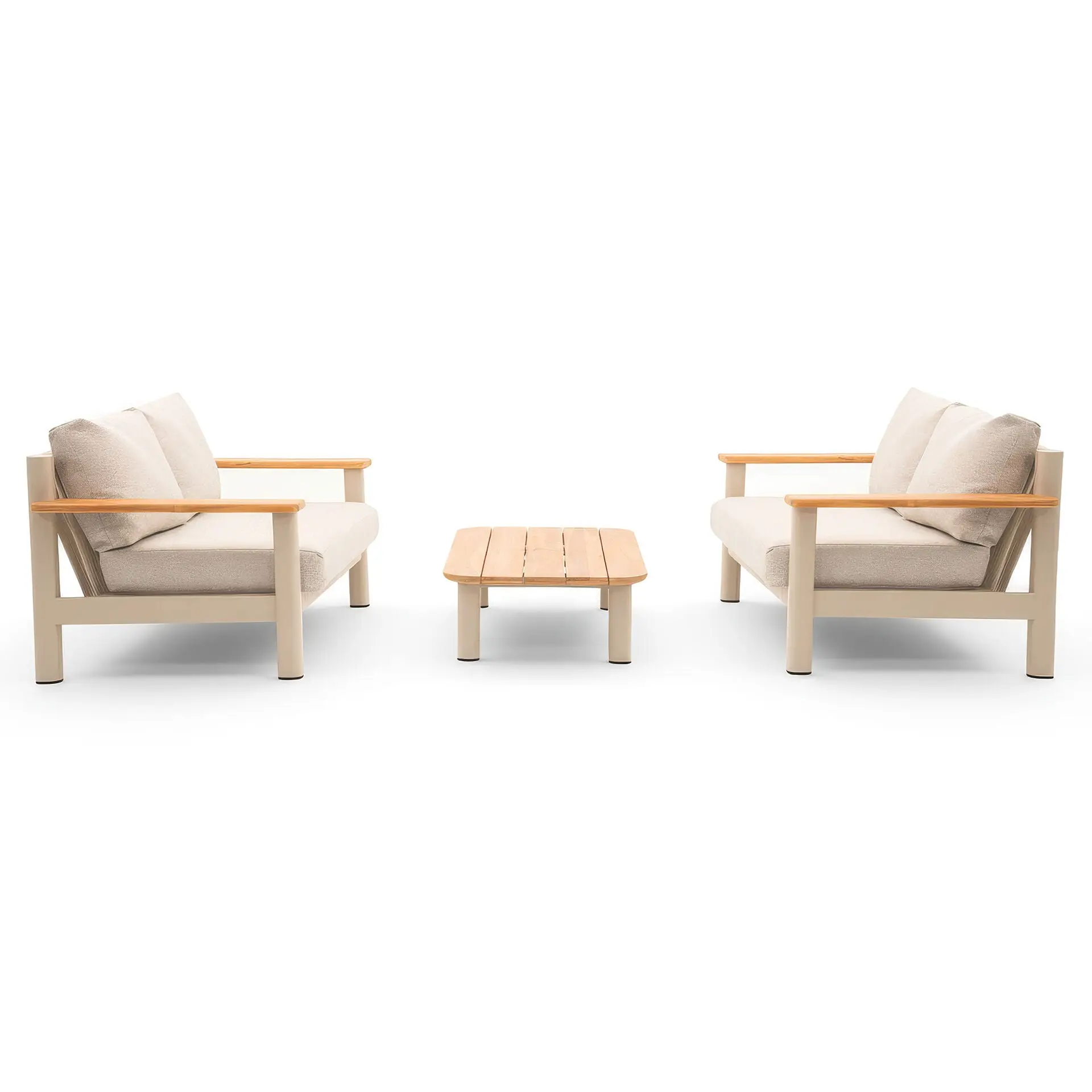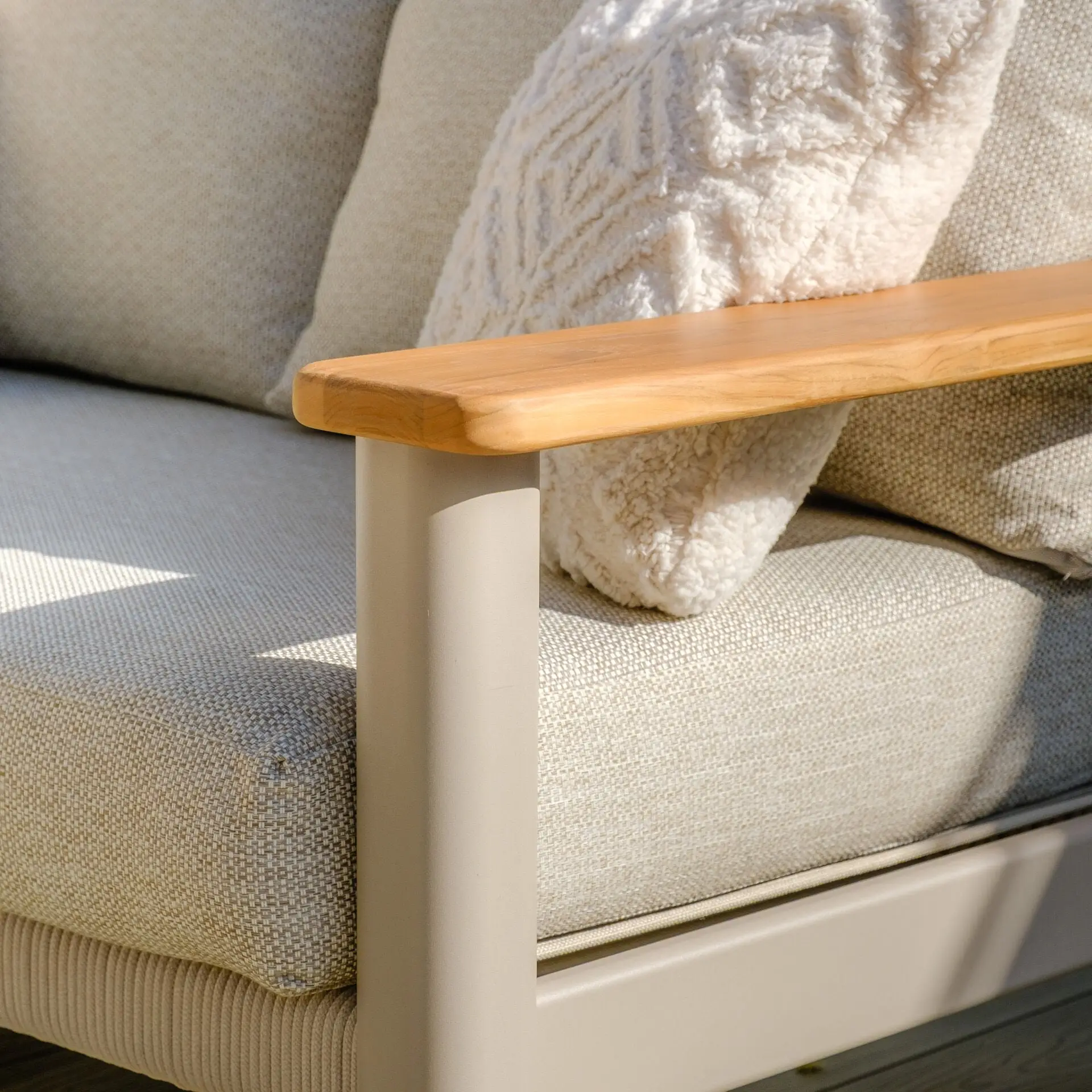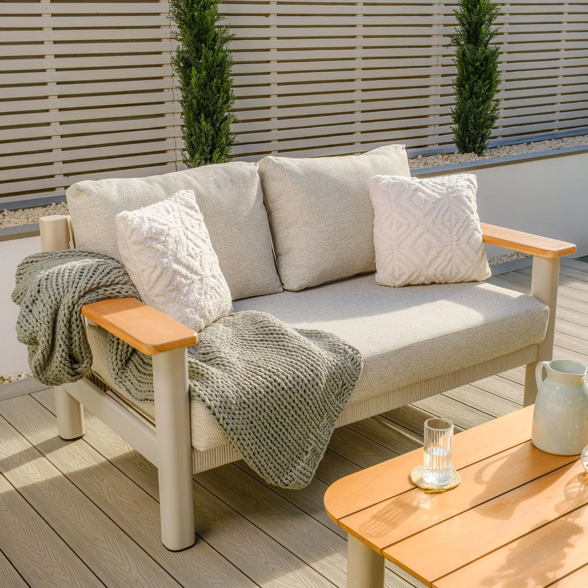 Sicily Rope Weave 2 Seat Sofa Set with Coffee Table, a stunning fusion of contemporary elegance and lasting quality, designed to transform your indoor or outdoor space into a haven of comfort and style. Crafted with meticulous attention to detail, this luxurious set combines solid natural FSC-certified teak wood with a powder-coated aluminium frame, achieving a beautifully balanced look that’s both timeless and durable.
