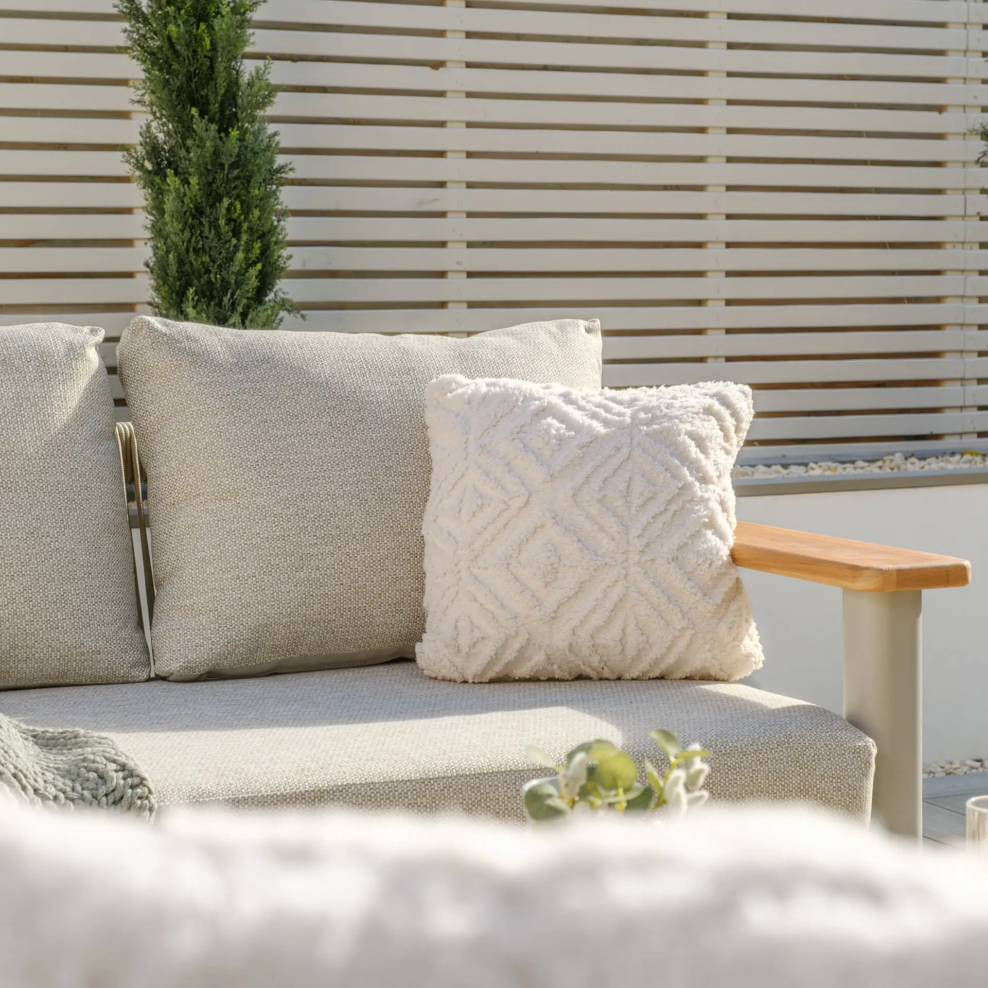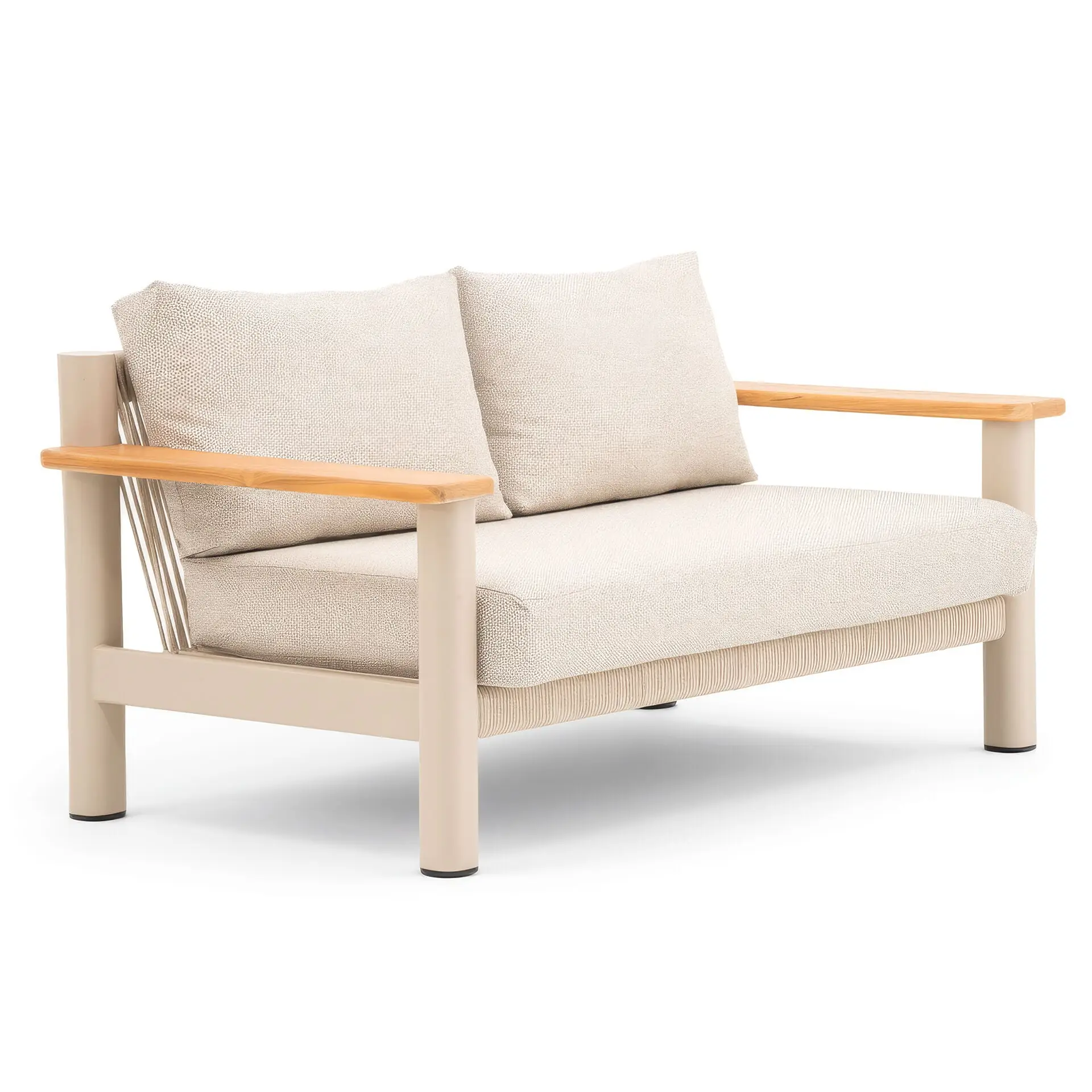 The generously sized two-seater sofa is intricately woven with polyester rope, offering a sleek modern aesthetic and supportive comfort. Plush polyester cushions enhance the experience, delivering exceptional softness while being shower-resistant and stain-resistant for easy maintenance and enduring beauty. The matching teak coffee table completes the set, creating the perfect centrepiece for relaxation or entertaining.