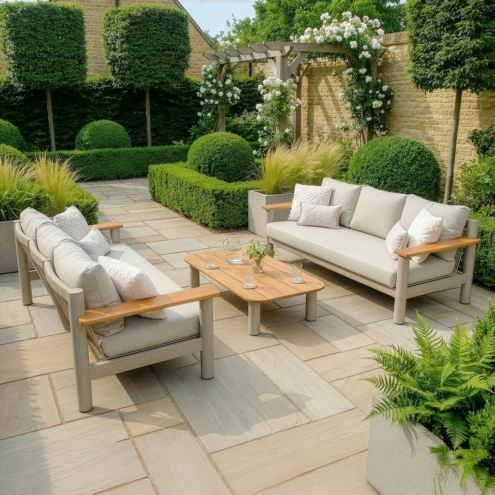 Expertly crafted, the set combines solid, natural FSC-certified teak wood with a powder-coated aluminium frame, creating a harmonious balance of warmth and strength that feels both timeless and enduring. The spacious three-seat sofa features an intricate polyester rope weave, offering a sleek, modern aesthetic and exceptional support. Plush polyester cushions enhance the experience with superior comfort, while their shower-resistant and stain-resistant properties ensure effortless maintenance and long-lasting beauty.