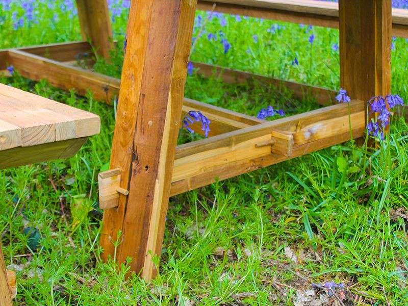 The table is hand finished in a superb rustic style with a chunky aspect and sturdy finish. The teak is genuinely reconditioned and crafted by hand making each one unique to you. The solid strips of teak that run along the table top are reflected in the strips along the benches, another little feature that looks great and enhances the appeal of this bench set as a whole.