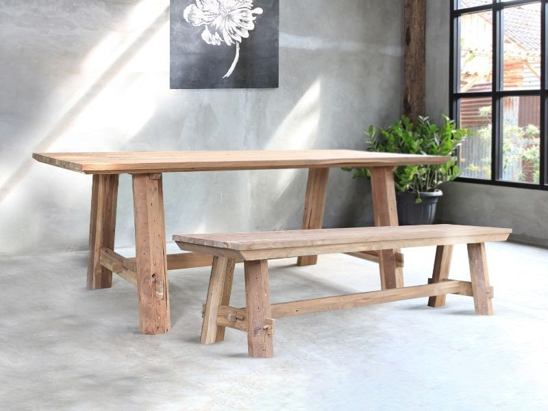 Solid panels of smoothly finished reclaimed teak root are used to form the legs on both the table and the benches that sit around it. The rustic appeal suits both commercial and domestic settings perfectly!