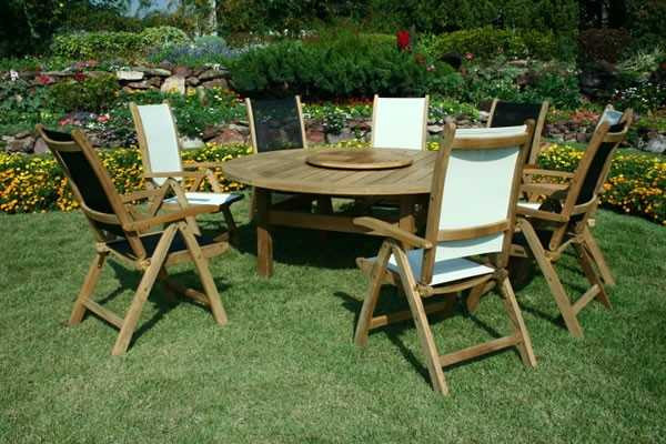 Chunky 210cm dia teak table, 8 teak & textolene recliner chairs & lazy susan