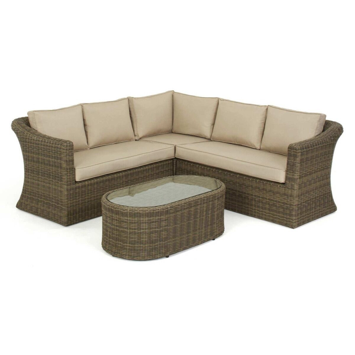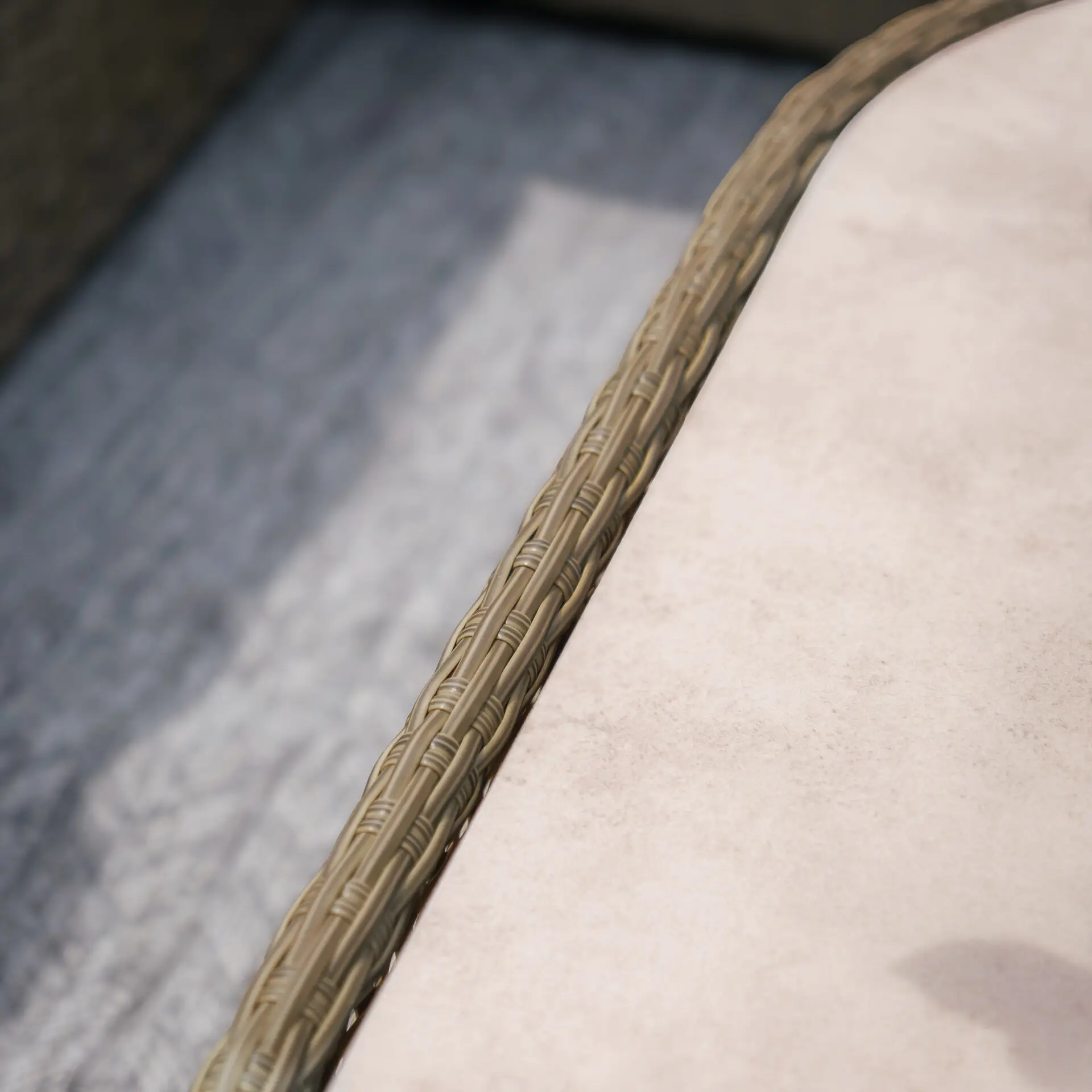 This classic look is achieved by using a natural-coloured round weave, creating the impression of wicker. The result is a finish that has a deep texture, with rounded corners for a more comfortable experience. This natural tone complements the accompanying beige cushions perfectly.