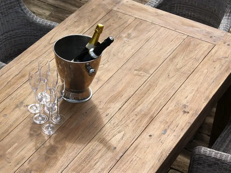 Finished with a black wash, this allows the grain to subtly show through the table to create a rustic character that will impress everyone! This table does not require any application of teak protectors as this will ruin the finish and overall quality of the wood.